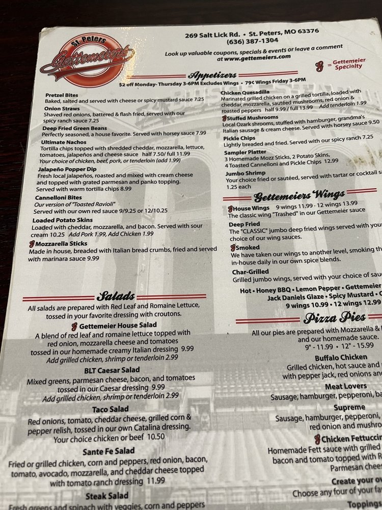 “ l'll start by telling you about our AMAZING server, Kevyn. There were 8 of us in our group. We dine out together every week, so I'm somewhat used to servers struggling with getting our orders correct. I know I would!!! 5 of us got the Fish Fry. Although we all got coleslaw with it, we all got a different 2nd side. The other 3 ordered something else completely different. Kevyn didn't write anything down. Just walked around and talked to each of us. And several of us asked questions in addition to placing our order. I expected that she might remember our orders, or at least close, but would get them confused when she brought them out. Again, I know I would! But no, she remembered every single one. Exactly. Brought out the food and confidently placed each plate in front of the correct person. I was blown away. Don't know how she does it, but AMAZING! And so friendly. Kept our drinks refilled and chatted all the time. I had been told about the Fish Fry in advance. And told it's extremely good. I've never had anything bad at Gettemeier's so I believed it. In fact, right now, they have an entire menu for Lenten options. One of my favorites at Gettemeier's is the wings, but my significant other isn't eating meat on Fridays but had to get in on $2 off Apps during Happy Hour, so got the Mozzarella Sticks as an appetizer instead this time. Oh my gosh! So good!! One of my friends got the Onion Straws with spicy ranch dipping sauce. WOW!!! In my opinion, although they're very thin (so the texture is very different), they'd give Texas Tonions or a Bloomin Onion a run for their money. And their spicy ranch dipping sauce tasted identical to the sauces that go with these. The fish was extremely tender and flaky. I'm not good at being able to identify fish, so don't really know if it was Cod or Haddock or something else, but it was DELICIOUS!!! They didn't skimp on the sides. I couldn't finish everything and I only got the 1/2 pound Fish Fry. Gettemeier's is a traditional sports bar. As such, there are A LOT of tvs. Everywhere. We went on a Saturday night when there weren't very many sporting events on, but I've been here on a Sunday afternoon during Football season. Every tv is tuned in to a different channel so you can watch most every game currently going on. They also have Keno. I'd never played Keno before coming here, but fun game! Although I didn't get to get in on any of these specials this time, right now they have Chili Mac (I'm not sure how much longer this will be available), free team trivia on Thursday nights, and specials when the Blues, Cardinals, Battlehawks, STL City SC, and Mizzou play. If you're looking for an upscale, quiet, elegant restaurant - Gettemeier's isn't where you want to go. But if you're looking for a sports bar with a relaxed atmosphere, OUTSTANDING food, friendly servers, and a moderately priced menu - you need to check out Gettemeier's. ”