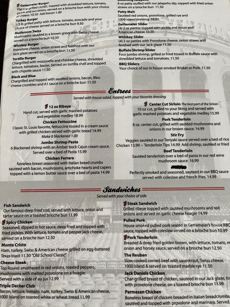 Gettemeier’s is a beloved burger and sandwich haven located in St. Peters, Missouri. Established with a passion for hearty, flavorful meals, it offers a diverse menu highlighting hand-cut beef entrees and signature wraps. The restaurant prides itself on a welcoming atmosphere, complete with outdoor seating and a full bar, making it perfect for families and groups. Signature dishes like the renowned Whiskey Burger have received rave reviews, celebrated for their generous portions and delectable flavors. With special nights, happy hours, and an inviting patio, Gettemeier’s is not just a dining spot, but a community hub for good food and great company.
